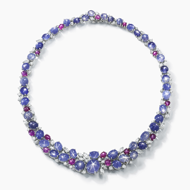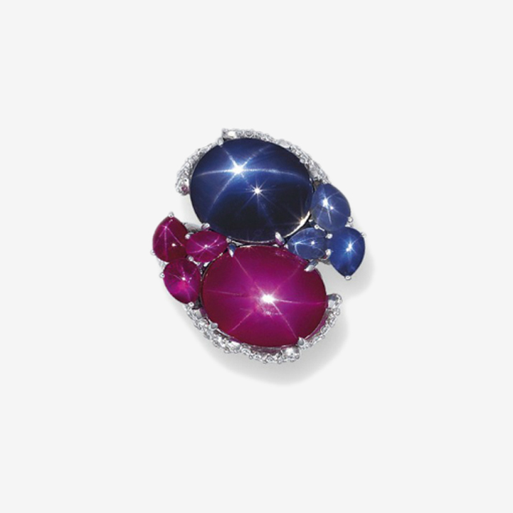 45 Oval Star Sapphires 182.46 ct, 16 Assorted Shape Star Rubies 17.55 ct, 36 Marquise Diamonds 7.85 ct, 46 Round Diamonds 4.49 ct.